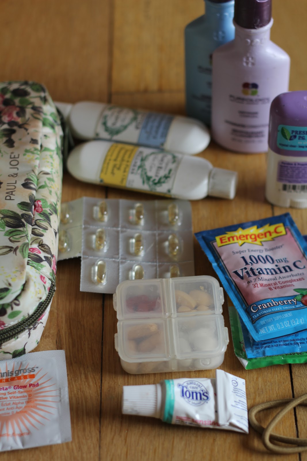 3. Treat yourself a bit. If you have great products and feel great it won't matter that you aren't staying in a 5 star hotel. For instance, I'm miserable without good shampoo and conditioner - so I stock up on the essentials in travel sizes. Also, I'm all about prevention - take your vitamins & emergen-C and you will be good to go. Below is a photo of products I simply can't live without while traveling. Plus they are all a-OK for your carry-on.